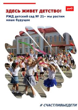 Мы рады приветствовать вас на официальном сайте РЖД детский сад № 21. Сайт адресован всем, кому интересно знать, чем живет наш детский сад. Он создается для Вас, уважаемые Родители, любимые Воспитанники и Педагоги, а также просто Гости сайта. На нашем сайте вы узнаете подробную и интересную информацию, связанную с образованием, воспитанием и развитием дошкольников! Познакомитесь с повседневной жизнью нашего учреждения, образовательными ситуациями, праздниками, конкурсами, детской деятельностью. Мы всегда рады Вам и Вашим детям!